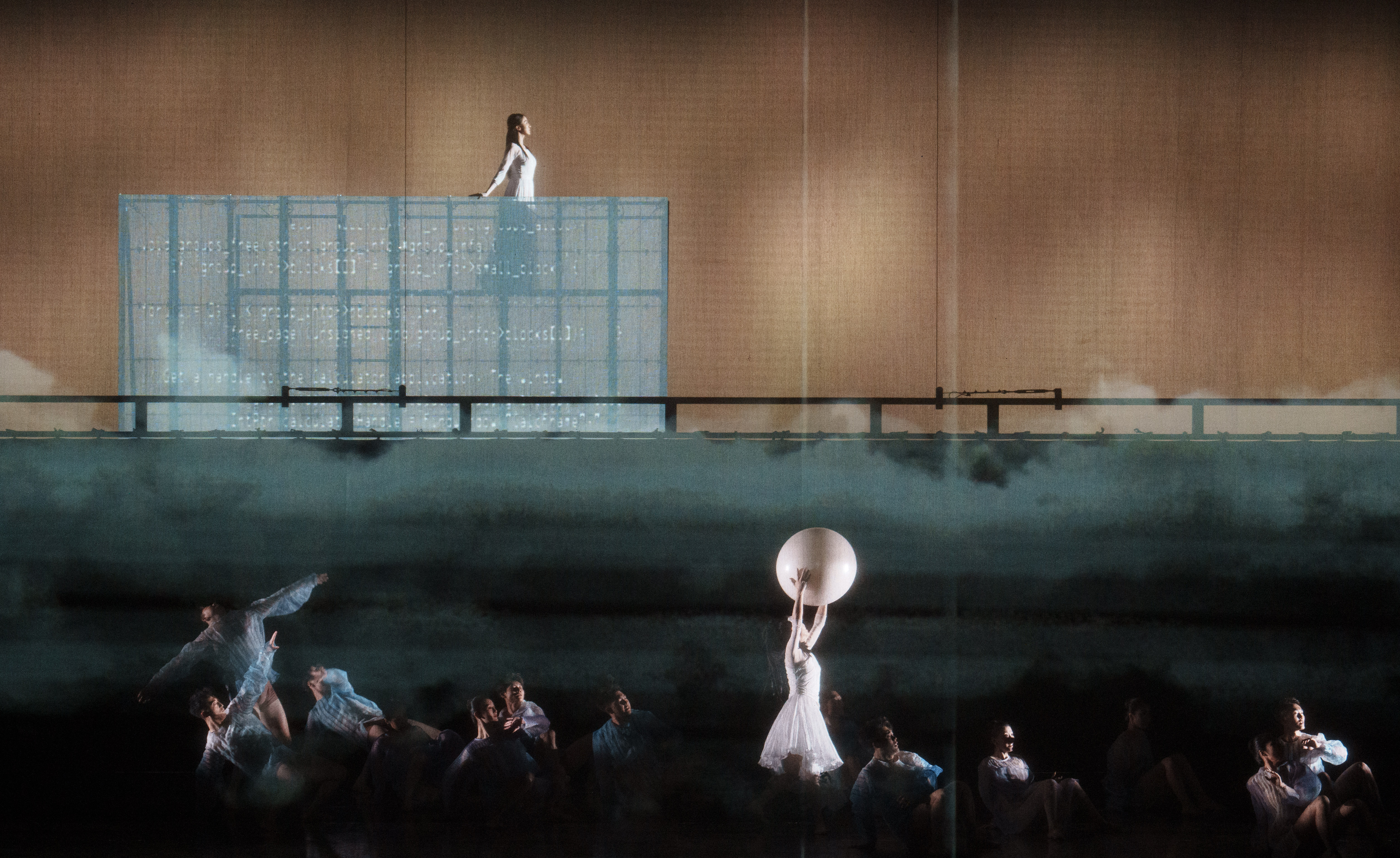 第一篇章《詩意地棲居》,運用舞蹈與各類視覺藝術(shù)交融的方式,編織出一個浪漫夢幻的詩意棲居之所,青山日出、綠水環(huán)繞、瑩瑩藍(lán)天、汩汩草浪,是廣闊天地之下是對美好生活的希冀,以一種詩意的生活方式讓人獲得內(nèi)心的滿足和恬靜。