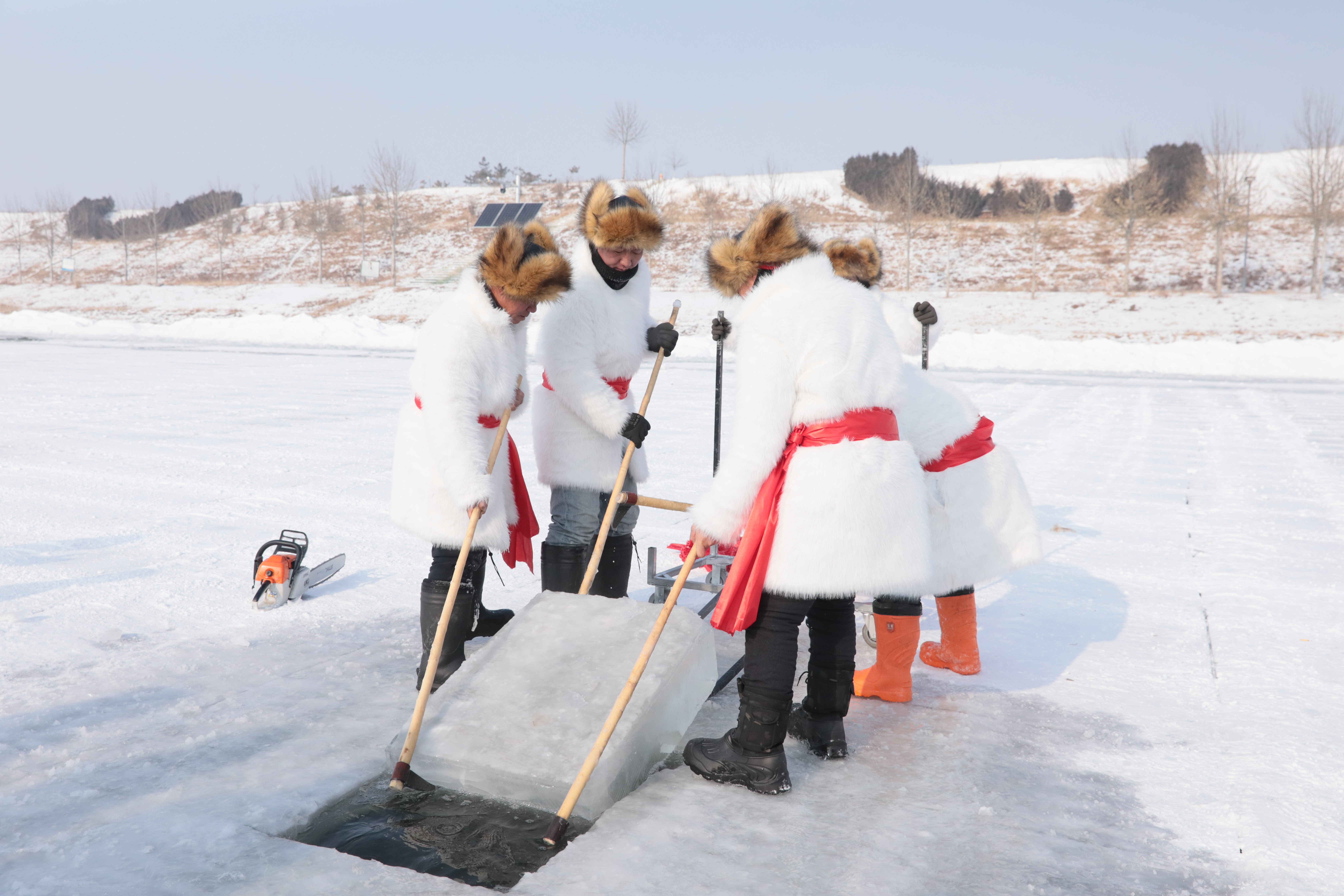? ? 隨后,采冰漢子們齊飲出征酒,采冰儀式開始,十幾名采冰漢子在《采冰號(hào)子》聲中合力采出象征著幸運(yùn)與福氣的大黑河今冬第一塊冰,系上紅繩寓意好兆頭,也代表著第三屆呼和浩特歡樂冰雪節(jié)夢(mèng)幻樂園全面開建。