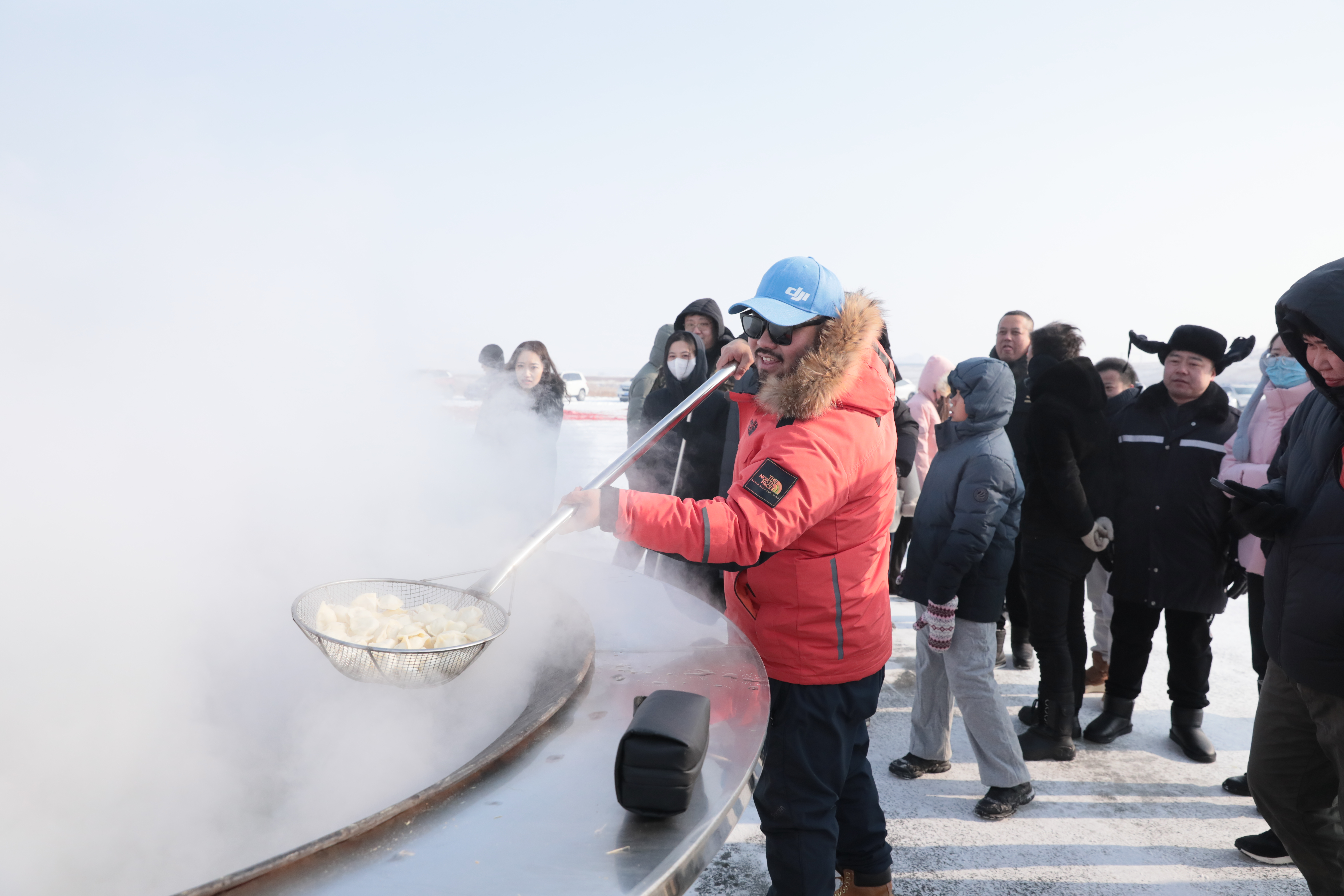 ? ? 活動(dòng)現(xiàn)場(chǎng),咕嘟冒泡的大鐵鍋里煮著熱氣騰騰的餃子,現(xiàn)場(chǎng)工作人員的熱情驅(qū)散嚴(yán)寒,一碗餃子一口熱湯,最是溫暖。傳統(tǒng)的采冰文化中沸騰著呼和浩特人的豪放與熱情。