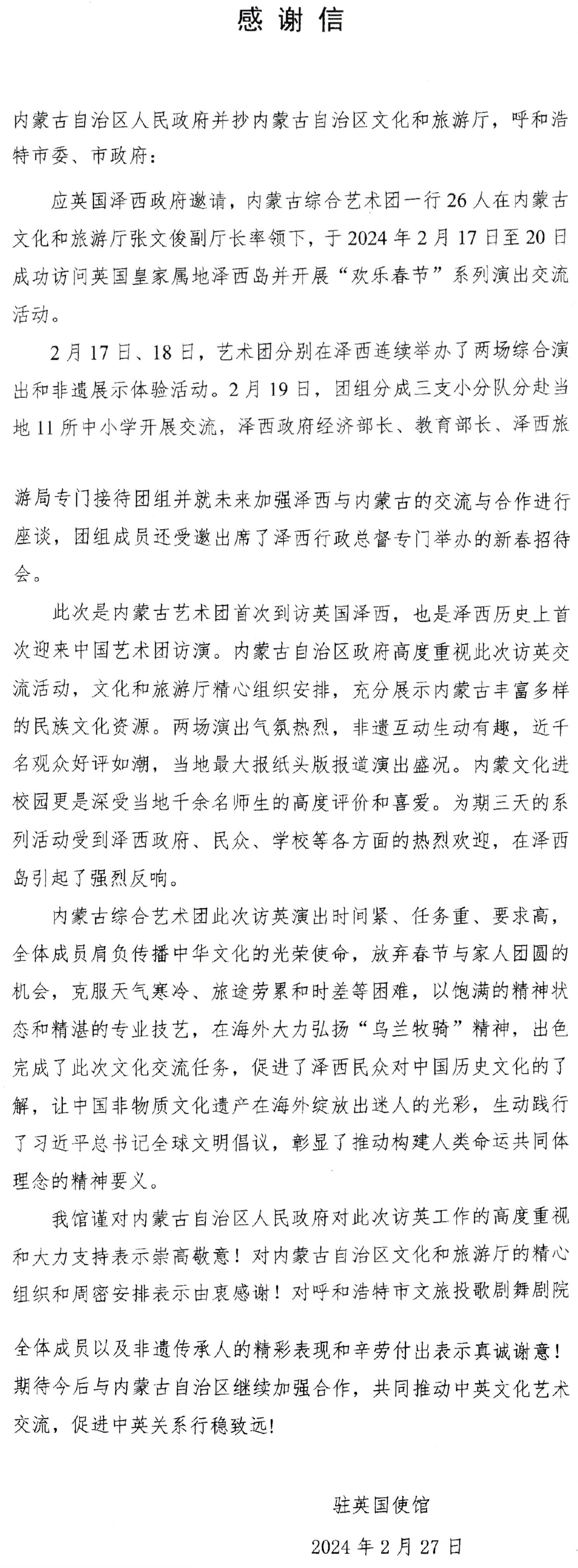 3月初收到駐英國使館感謝信,信中提到,此次內(nèi)蒙古綜合藝術(shù)團(tuán)是英國澤西島歷史上首次迎來的中國藝術(shù)團(tuán),兩場(chǎng)演出活動(dòng)好評(píng)如潮,在當(dāng)?shù)刈畲髨?bào)紙頭條報(bào)道。內(nèi)蒙古文化進(jìn)校園更深受當(dāng)?shù)厍в嗝麕熒母叨仍u(píng)價(jià)和喜愛。出訪團(tuán)在訪英演出時(shí)間緊、任務(wù)重、要求高,全體演職人員肩負(fù)傳播中華文化的光榮使命,以飽滿的精神狀態(tài)和精湛的專業(yè)技藝,在海外大力弘揚(yáng)“烏蘭牧騎”精神,出色完成各項(xiàng)文化交流任務(wù),生動(dòng)踐行了習(xí)近平總書記全球文明倡議,彰顯了推動(dòng)構(gòu)建人類命運(yùn)共同體理念的精神要義。