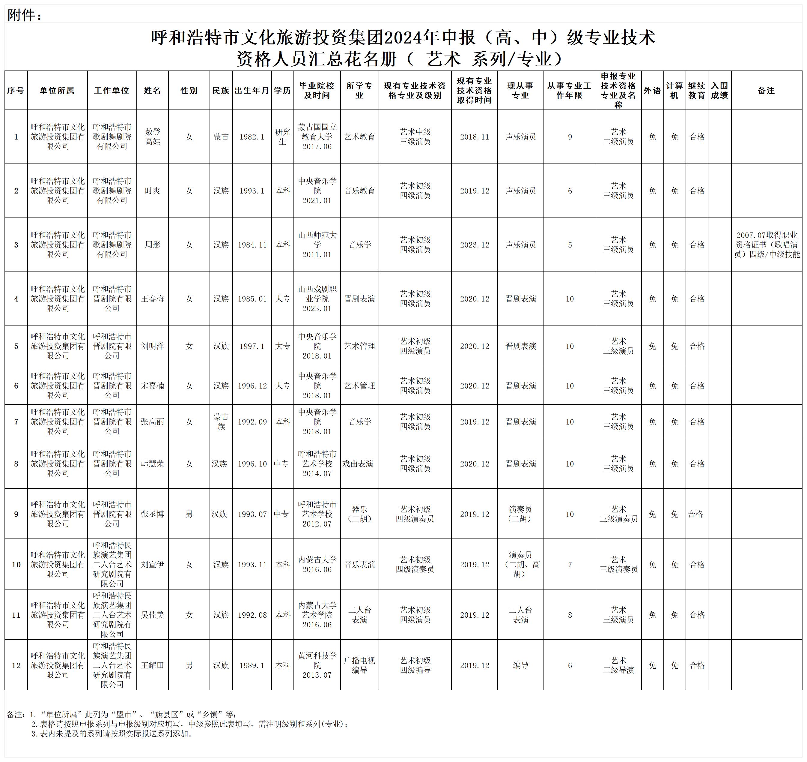 附件:呼和浩特市文化旅游投資集團(tuán)有限公司2024年申報(高、中)級專業(yè)技術(shù)資格人員匯總花名冊(藝術(shù)系列/文學(xué)創(chuàng)作系列/專業(yè))