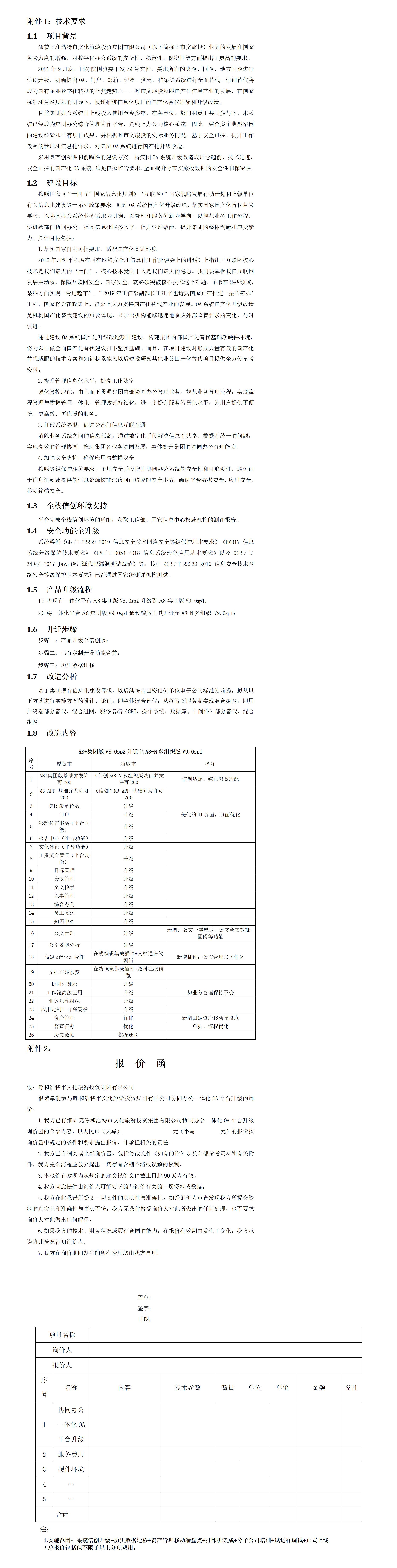 呼和浩特市文化旅游投資集團有限公司協(xié)同辦公一體化OA平臺升級詢價函