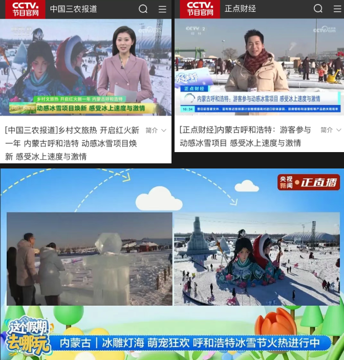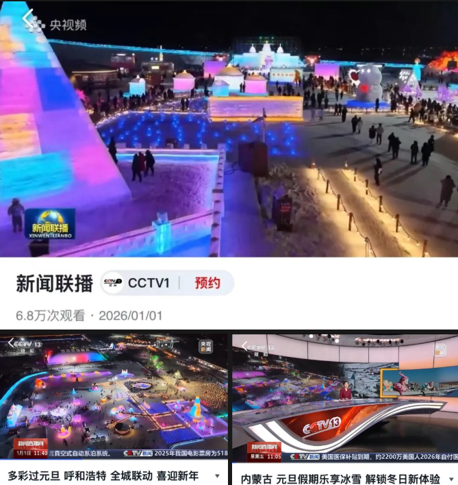 以“冰雪+非遺”為主題的跨年、元旦聯(lián)歡活動(dòng)還受到中央廣播電視總臺(tái)CCTV-1《新聞聯(lián)播》欄目報(bào)道。此外,央視《新聞直播間》《朝聞天下》等品牌欄目也對(duì)活動(dòng)予以報(bào)道,并在央視新聞客戶端開展專場(chǎng)直播。8次央視新聞聚焦,10余家央級(jí)媒體、多家省市級(jí)主流媒體及主要商業(yè)平臺(tái)發(fā)布相關(guān)報(bào)道近千篇,形成多層次宣傳格局,將呼和浩特歡樂冰雪節(jié)推向全國(guó)視野。